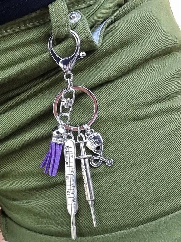 Leuke Sleutelhanger vb een verpleegster aan de hanger zit een naald spuit stethoscoop medische doos plus wen leuke kwast in de kleur paars.Ook leuk om iemand kado te geven.